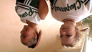 Cheerleader in panties licking ballsack in ffm porn shoot