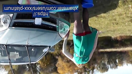 Milf Beautiful Sexy Blonde Outdoors On River Bank Washes Car Without Panties And Bra Under Dress. No Panties In Public