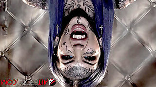 Tatted slut Lily Lane fettered up with a huge dildo in her throat