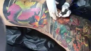 Marie Bossette touches herself while being tatted