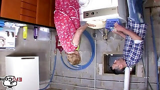 Ugly obese blonde garage manager fuck her employee, eating his cum